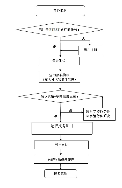 (2)本次考试全市各考点全部实行网上报名,需要参加大学英语四六级考试的同学请在规定时间内尽快完成网上报名和缴费,报名工作截止后,无法接受任何理由的补报名。 (3)请使用火狐浏览器、谷歌浏览器、IE9+、360浏览器(选择极速模式)访问报名网站。 四、报名流程 1.考生需要注册ETEST通行证账号; 2.必须在网上注册时间段内进行网上报名; 3.考生报名时必须先查询报名资格,有资格的考生才可以报名; 4.报考顺序为先报考笔试科目再报考口试科目,公司口试未开考,请选择其他考点报考; 5.网上支付时,必须先支付笔试科目才能支付口试科目; 6.考生对学校、院系、照片等信息进行核对,确认无误后再进行报名缴费操作,缴费成功后才算报名完成,系统会给考生发送邮件通知(若系统显示学籍库无匹配项或无学籍照片,处理办法见教务处网页3月11日“关于2022年6月全国大学英语四六级考试学籍信息维护工作的通知”); 7.考生报名12小时未支付的科目,系统会自动删除; 8.考生报考六级时,系统自动对其四级成绩进行审核,若有异议,考生可在报名系统中提交英语四级成绩在425分及以上考试准考证号申请进行再次审核,审核结果通过邮件通知; 9.报名过程中请仔细阅读报名网站相关说明,除下面10中两种情况以外,其他任何问题,请联系报名咨询电话:010-62987880。 10.以下两种情况请联系教务处教学运行科:68367290。 (1)考生符合报考条件,但未查询到报考资格; (2)考生学校、院系及照片等学籍信息有误。 附:报名流程