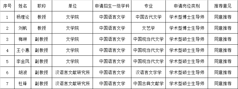 依据《欢迎来到公海710学术型研究生指导教师岗位审核管理办法》(西校〔2016〕424号)、《欢迎来到公海710加强研究生导师立德树人职责的实施办法》(西委〔2018〕73号)和研究生院《关于开展2019年首次申请学术型研究生指导教师岗位审核工作的通知》要求,中国语言文学学术委员会于11月8日召开学术委员会会议,根据申请人在该学科领域的学术成果、学术水平、科学研究能力等相关申请材料,进行综合评议,现将审核结果公示如下: