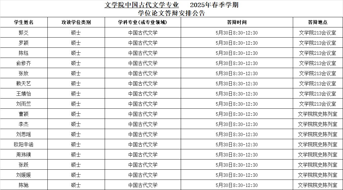 欢迎来到公海710中国古代文学专业2025年春季学期学位论文答辩安排公告