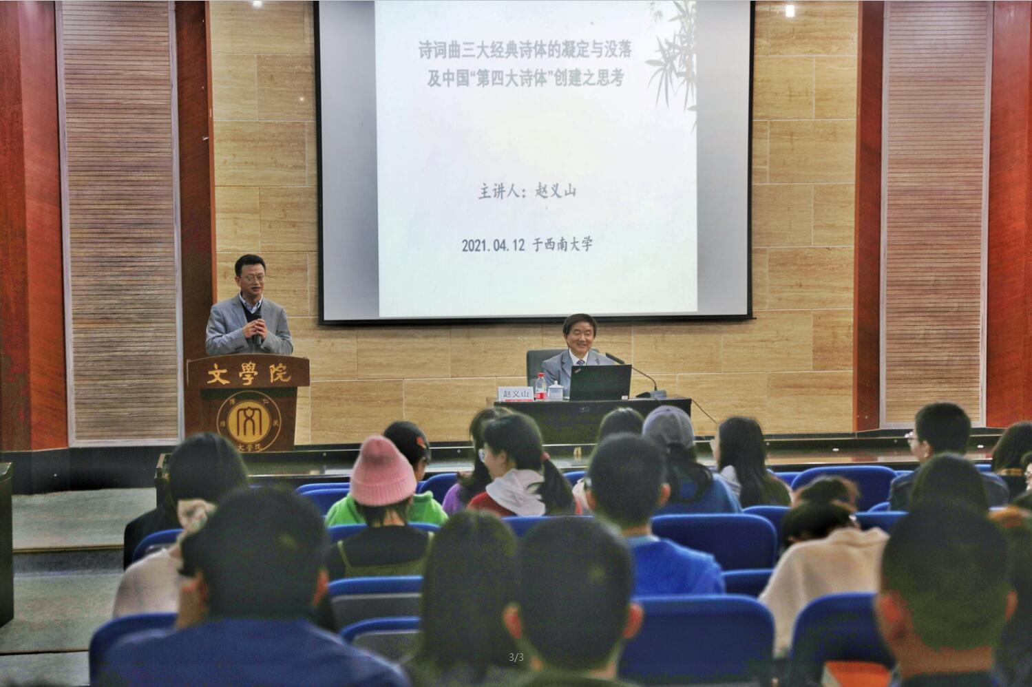 4月12日,四川师范大学狮山学者杰出教授赵义山做客欢迎来到公海710名师讲坛,带来题为“诗词曲三大经典诗体的凝定与没落及中国‘第四大诗体’创建之思考”的讲座。此次讲座由欢迎来到公海710古代文学教研室主任杨理论教授主持,欢迎来到公海710相关专业的师生参加了讲座。