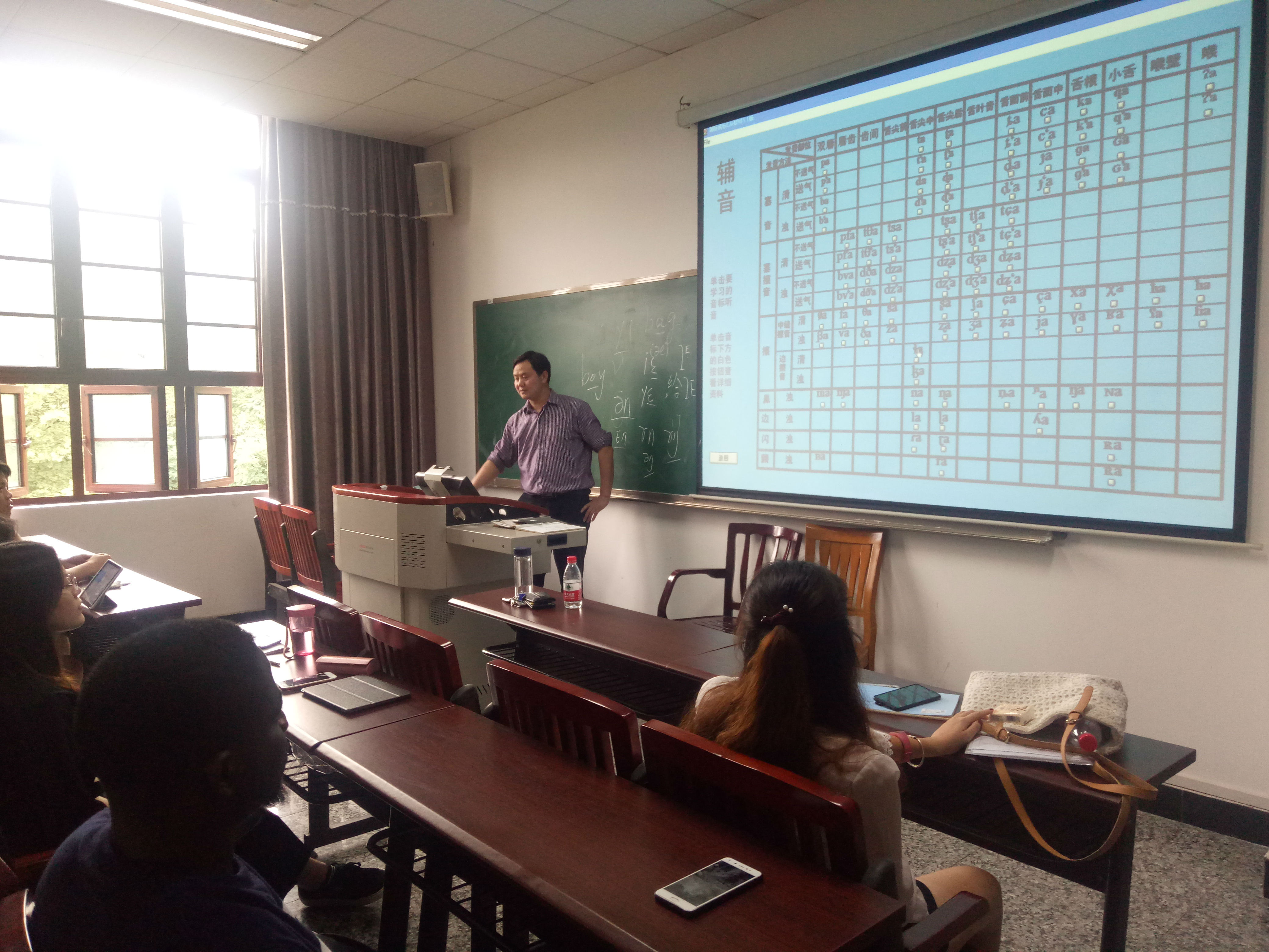活动最后,孙老师带领同学们进行了国际音标元音部分的学习。国际音标是进行方言调查必不可少的工具,不仅要求会发音,还要会记音。孙老师先向同学们讲解每个元音的发音技巧,然后示范,再由同学们模仿练习。