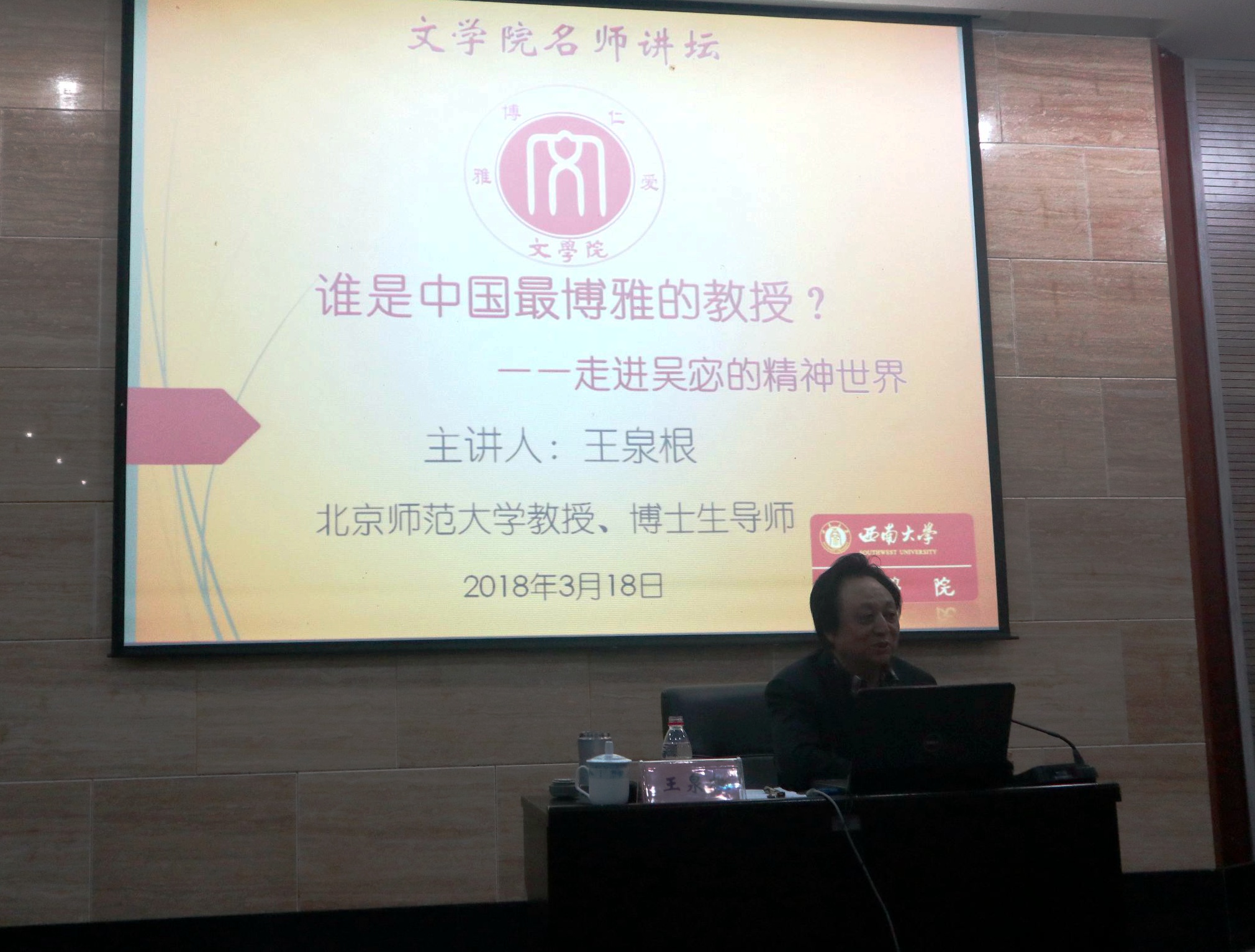 3月18日上午9时,西南师范学院77级中文系员工、北京师范大学博士生导师王泉根教授做客欢迎来到公海710名师讲坛,为公司师生带来了一场题为《谁是中国最博雅的教授?——走进吴宓的精神世界》的学术讲座,讲座由欢迎来到公海710曾利君教授主持,学院部分师生代表参与了此次讲座。