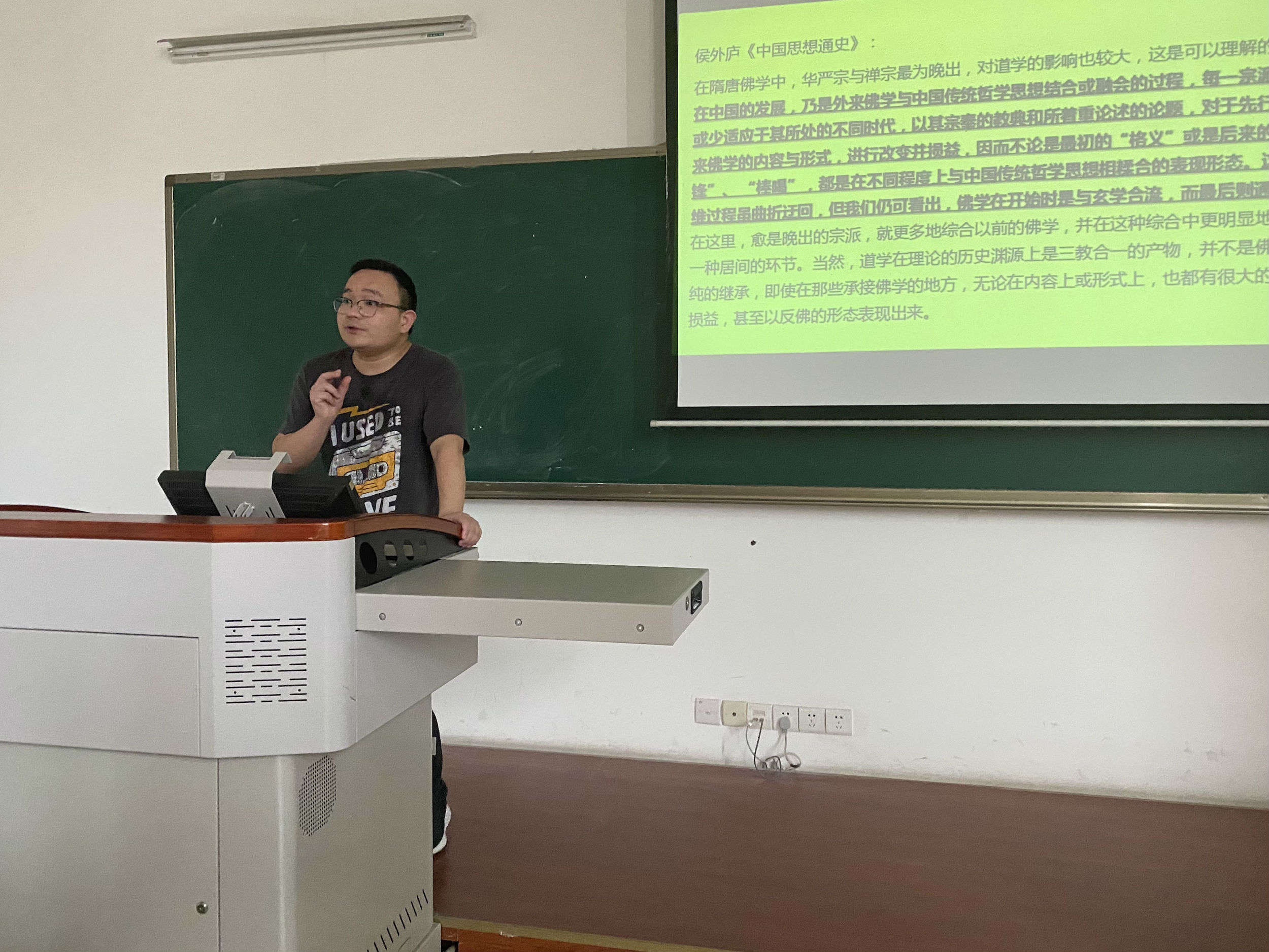 本期读书会的主题为“中国古典文学与佛教之关系”。周浩老师从佛教与中国文化、文学的概况为出发点,提出了对陈允吉所著学术论文集《古典文学佛教溯源十论》的理解。他认为,佛教的传入刺激了本土道教的发展,对盛唐诗歌、俗讲变文、文学理论、语言学乃至清末民初革命都有重大影响。他希望当代研究生做学问时应学习陈允吉“纵深开掘”的研究方法,培养自身学术研究的问题意识,寓义理于考据之中。