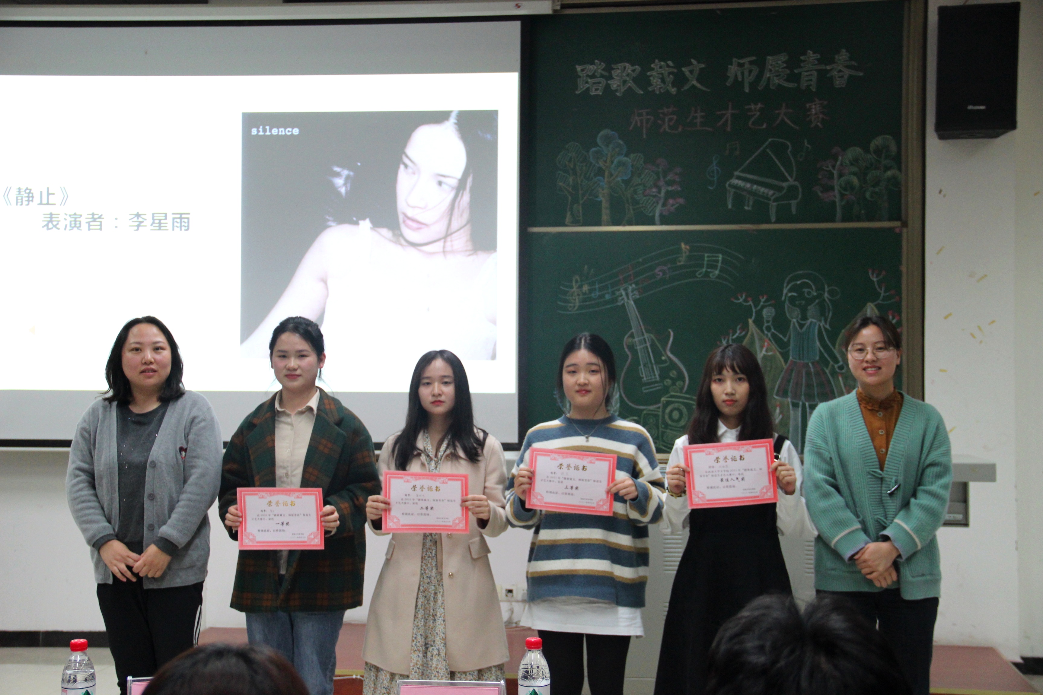 活动最后,经过现场紧张的票数统计和分数计算,贺月同学获得第一名,蒲欣艺同学获得第二名,谯芸同学获得第三名,何映霖同学获得最佳人气奖。唐利平老师和曾馨老师为获奖同学颁奖并合影留念。本次师范生才艺大赛落下帷幕。