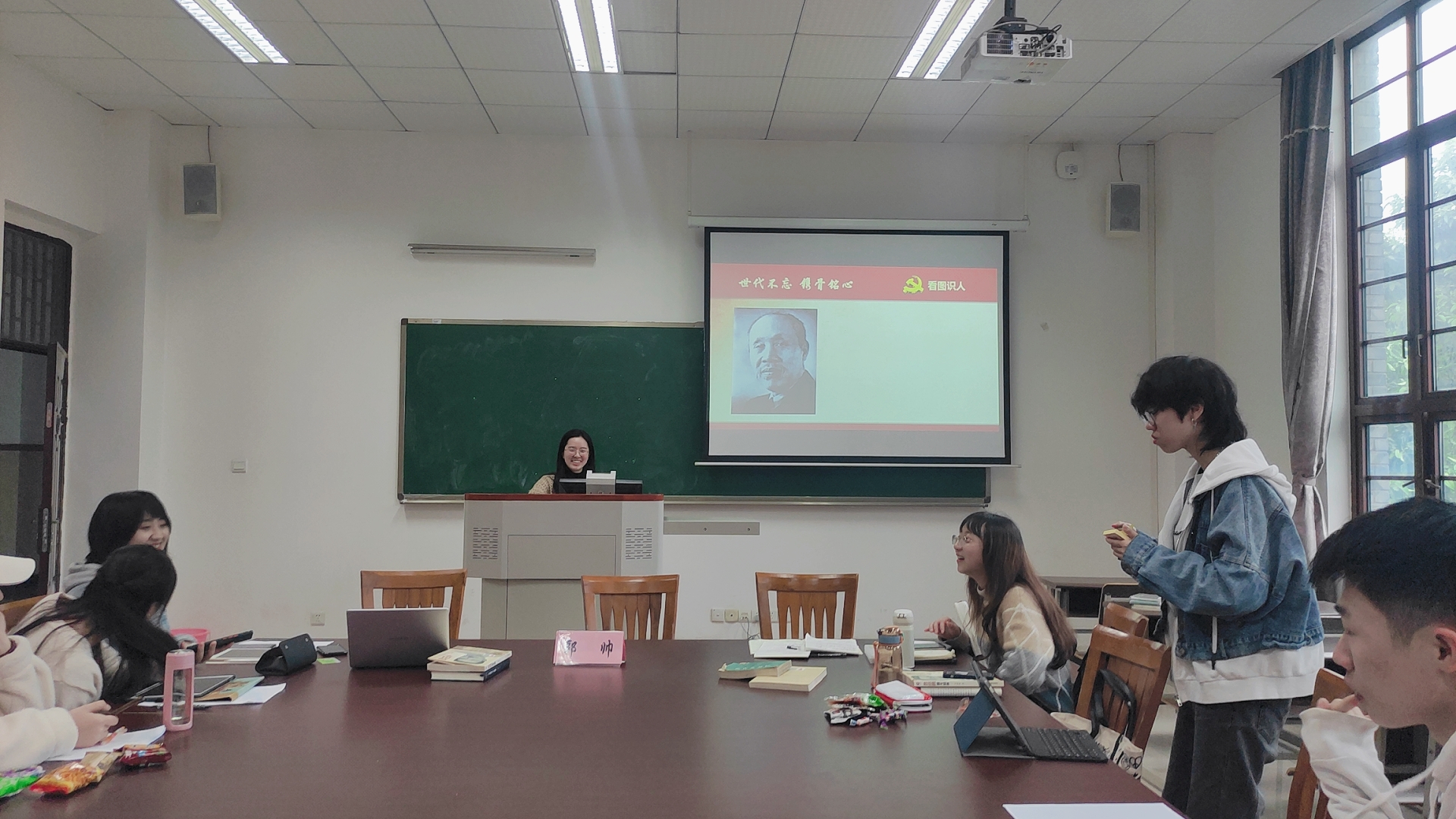 郭帅老师介绍了中国共产党员对动员全民抗战的艰苦奋斗史,谈到了大批左翼作家抗战事迹,讲述了万千知识分子奔赴延安的感人事迹。针对同学们对左联领头人鲁迅先生为何不是中国共产党疑问的讨论,郭帅老师认为,鲁迅先生是中国共产党的同行者,留在党外发挥的作用更大,更能起到团结作用。鲁迅先生具有超人格的思想,立底层小人物,具有深刻国民性。