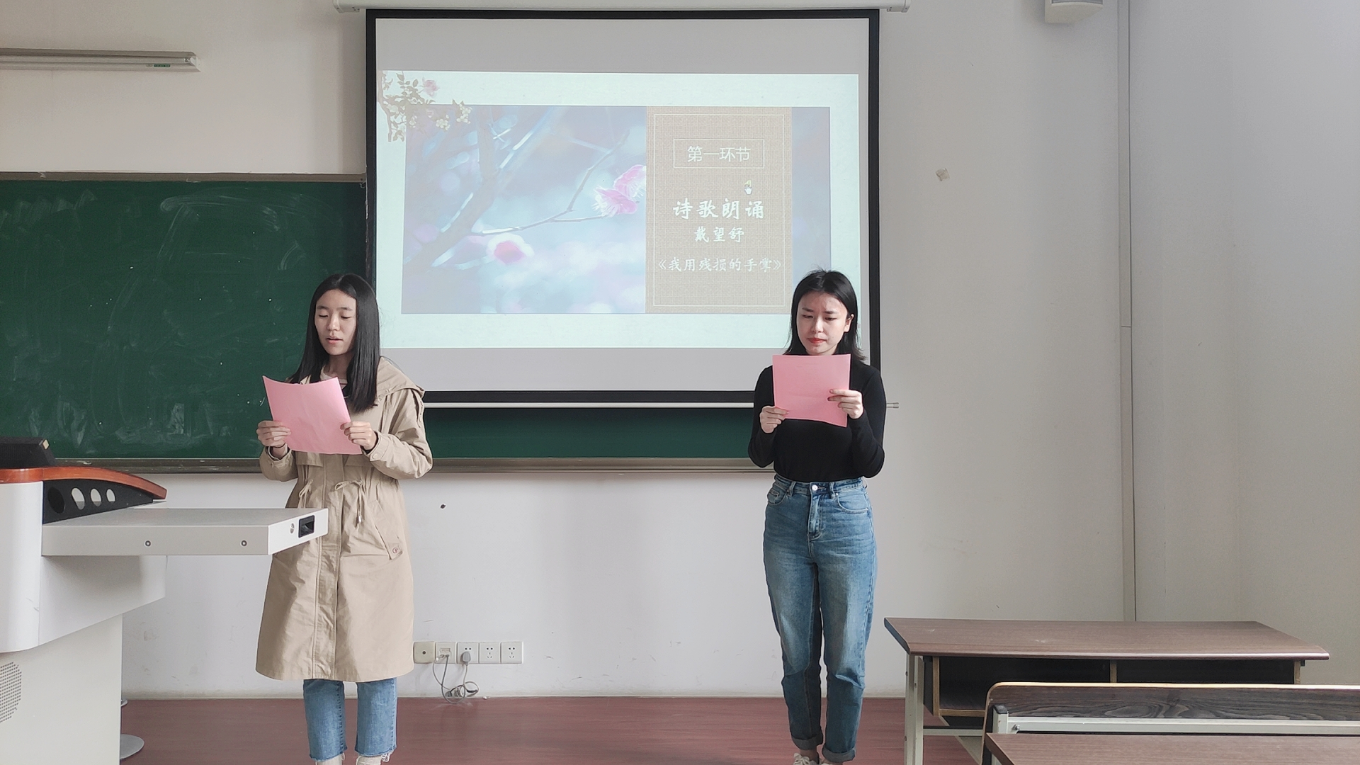 2020级古代文学专业肖雪媛同学和赵乾英同学慷慨朗诵诗歌--《我用残损的手掌》拉开了活动序幕。