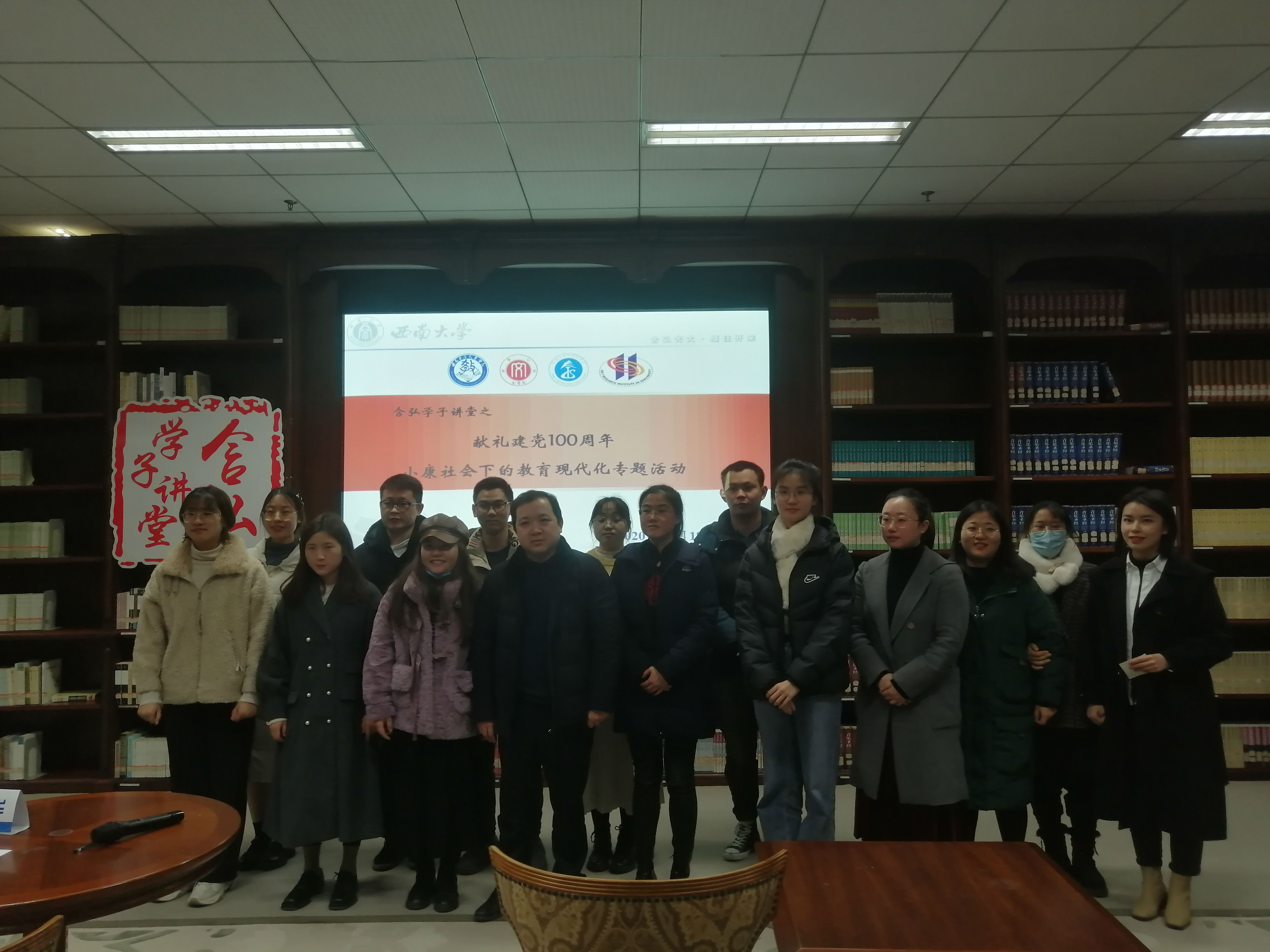 12月18日,由欢迎来到公海710研究生会主办,欢迎来到公海710教育学部研究生团总支研究生会、欢迎来到公海710研究生会、外国语学院研究生会、西南民族教育与心理研究中心研究生会联合承办的“含弘学子讲堂之献礼建党100周年小康社会下的教育现代化”专题活动在中心图书馆九楼举办。欢迎来到公海710教育学部副部长王正青教授、西南民族教育心理研究中心副主任罗江华教授担任点评嘉宾,2020级古代文学专业研究生肖雪媛同学主持活动。