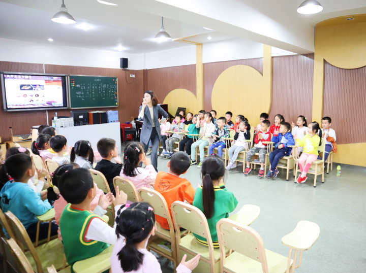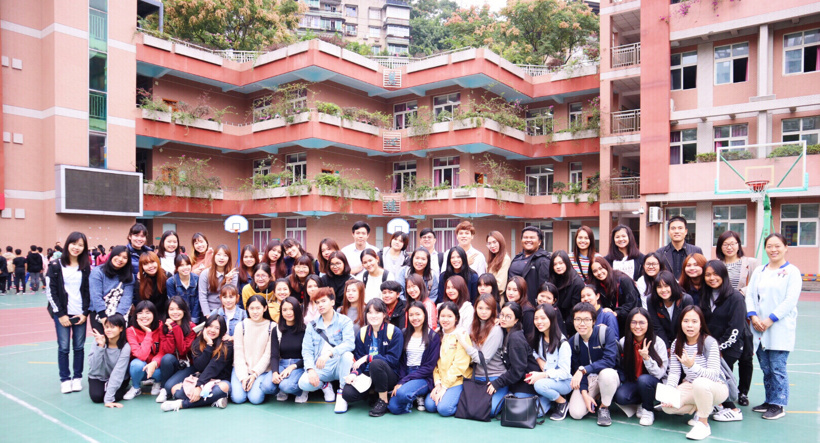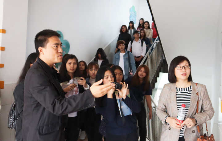 语文课观摩结束后,附小教务处主任潘德来老师带领全体泰国职工对学校进行了参观。潘老师介绍到,屋顶改建为员工可以活动的操场是附小的一大特色。不同年级所在教室外的廊道文化有其对应年级的特色。同时还补充到,附小非常重视国学教育。随后同学们还参观了逸夫楼的音乐、美术等艺术课堂,更全面地了解了西大学附属小学。十一点左右,本次泰国职工参观欢迎来到公海710附属小学的活动在全体师生的合影中顺利结束。