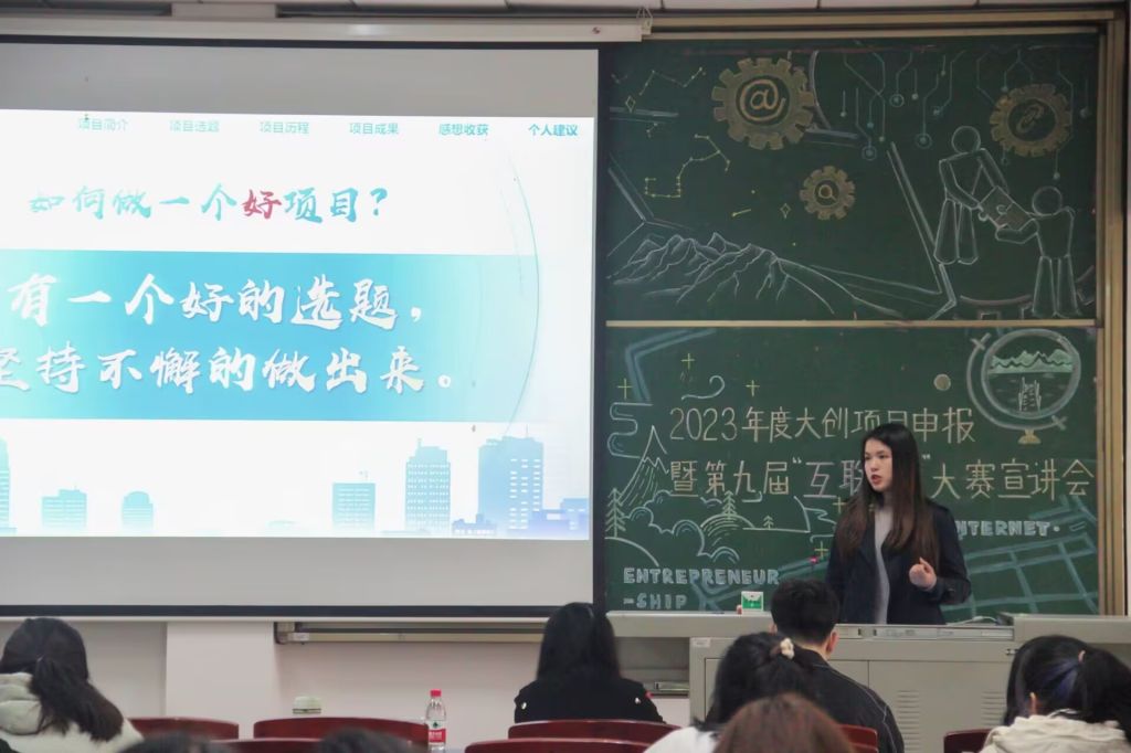 张桢炜着重讲解了“互联网+”参赛流程及规则,详细介绍了学校的创新创业相关政策、专业场地等配套资源,使同学们对申报的细节要点有了更进一步的把握。