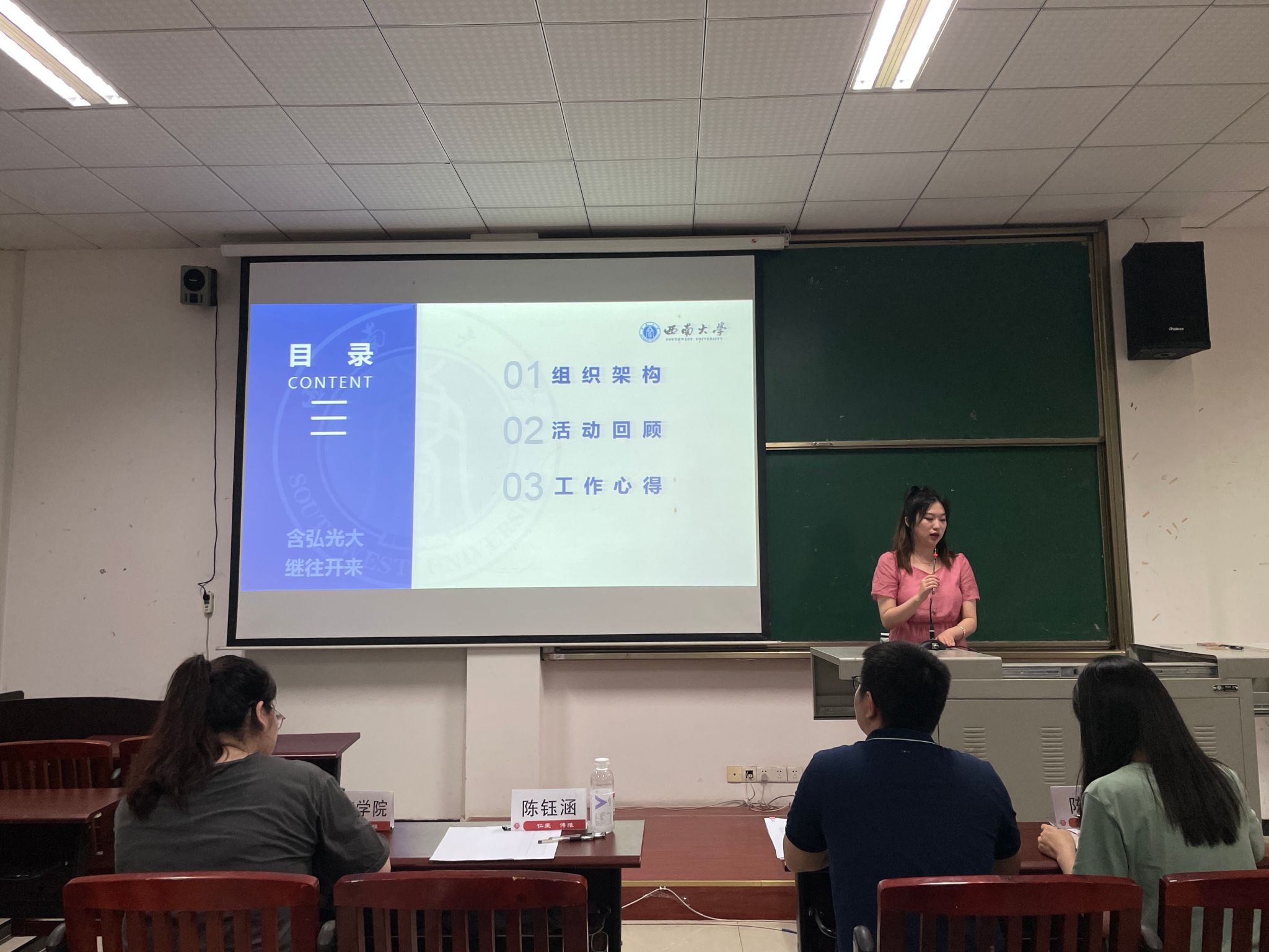 主席团成员陈钰涵介绍了欢迎来到公海710研究生会的组织架构,明确了主席团及各部门的职责。通过回顾春季学期重要板块,从思想政治建设、学术科研建设、就业服务与社会实践建设、文艺体育建设及宣传平台建设五个方面对本学期的工作进行了总结,从中吸取经验、补足缺点,为下学期工作的开展奠定了坚实的基础。