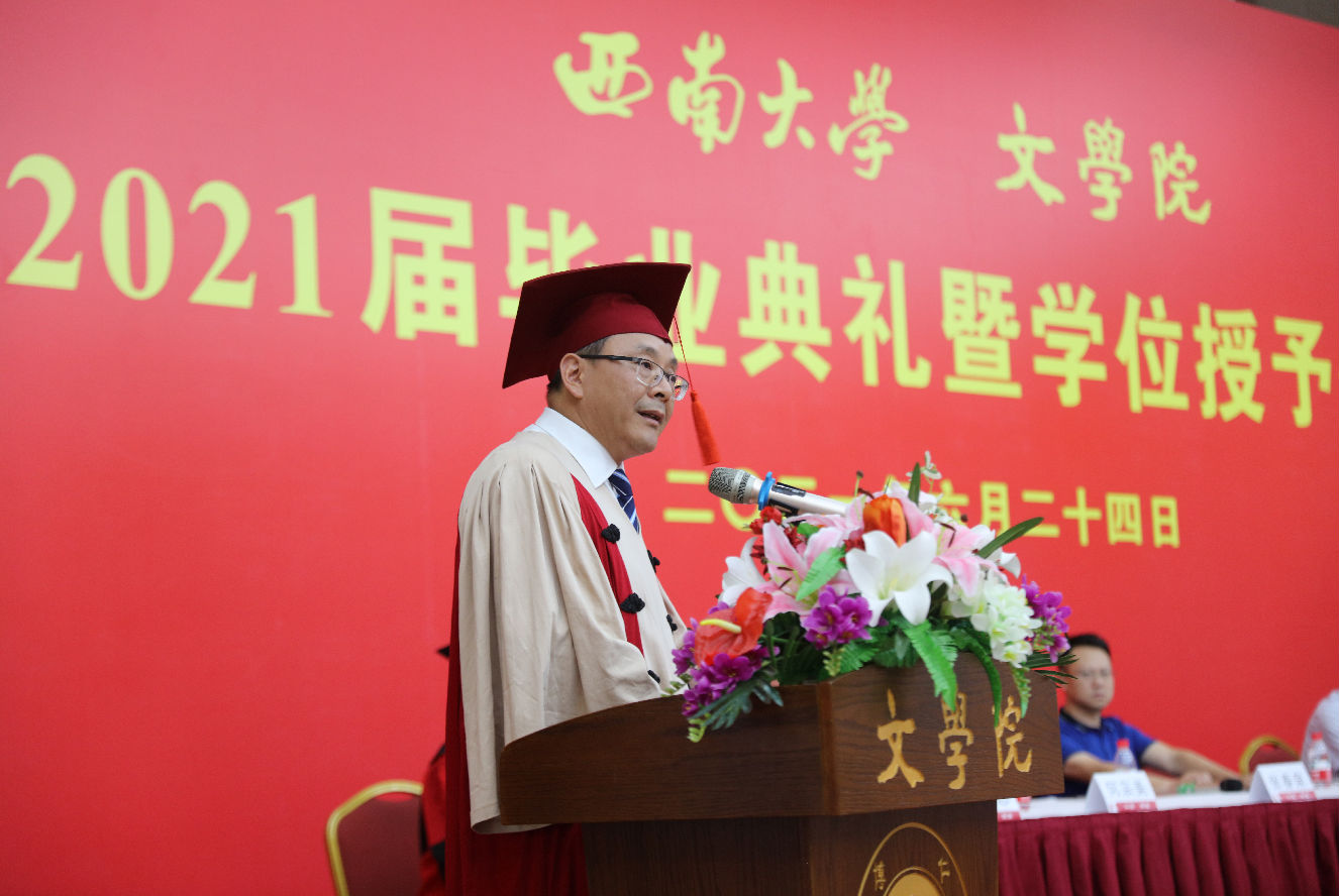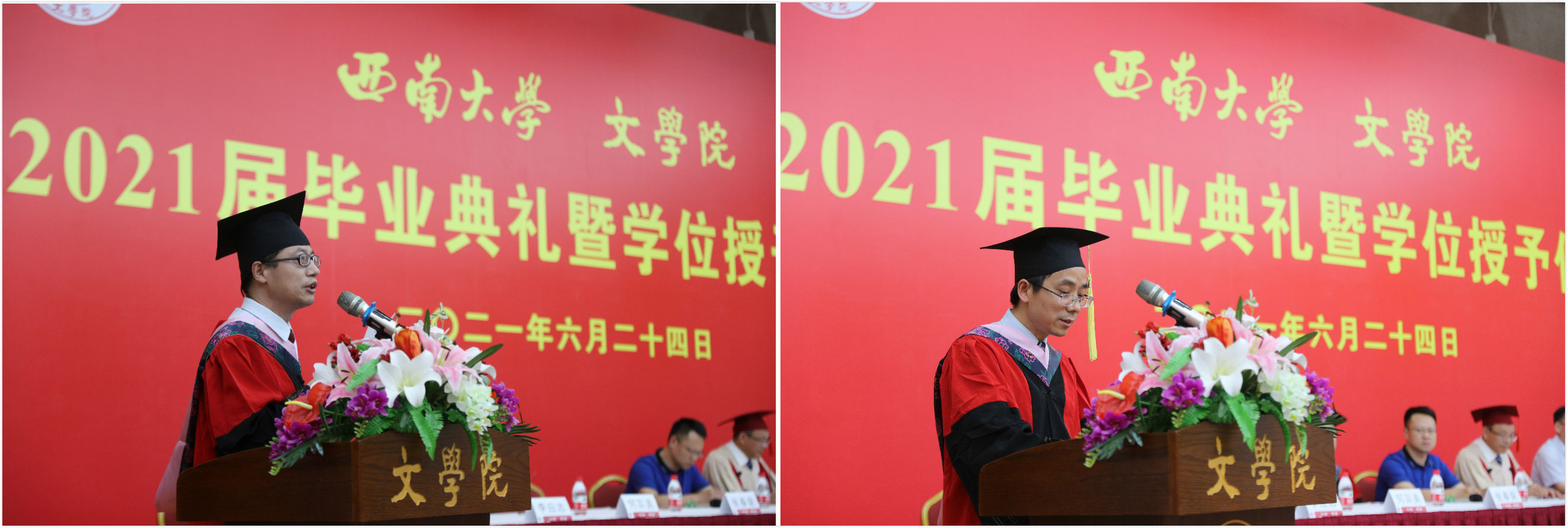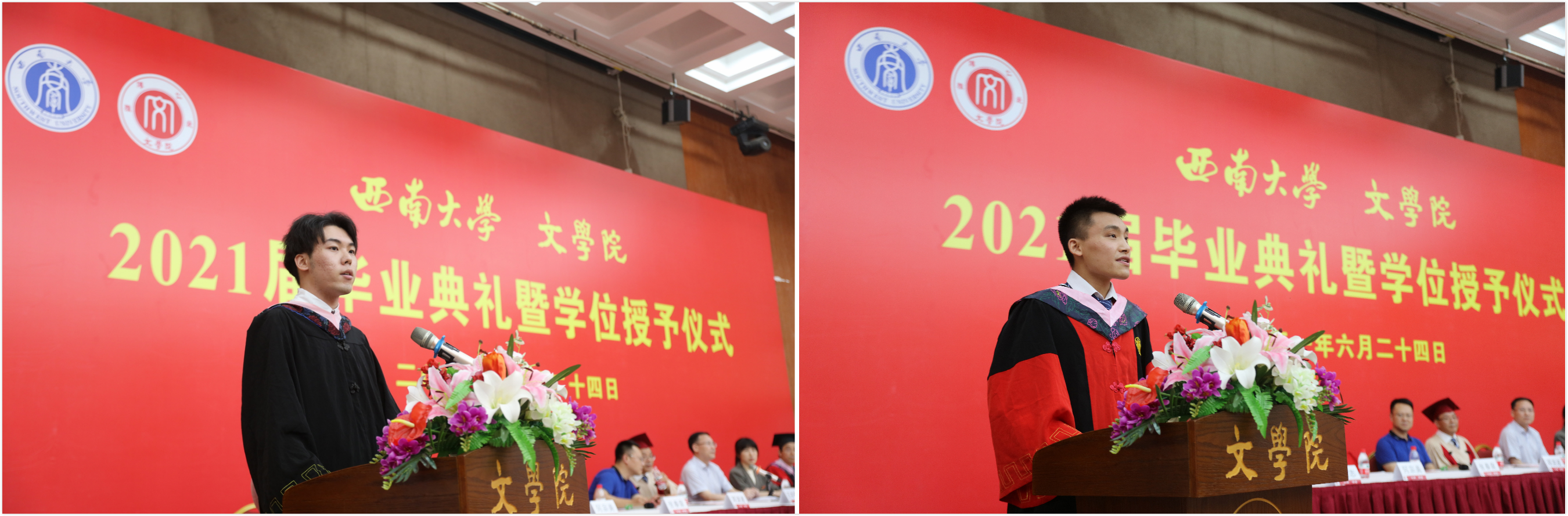 2017级汉语言文学专业本科生孙旭江、2018级中国现当代文学专业博士生高强先后代表毕业员工发言。孙旭江在校期间获国家奖学金,校特等奖学金等各类市级、校级荣誉共计30余项。他分享了大学四年在欢迎来到公海710的成长与收获:做有“深度”的人,善于在奋斗中收获成长;做有“热度”的人,勇于在实践中承担责任;做有“温度”的人,永远要记住感谢与感恩。高强讲述了自己由工转文的蜕变和思想观念深造的经历,向学校、学院、老师和同学们表示感谢,分享了自己对工科文科差异和学院精神文化的理解。他鼓励欢迎来到公海710毕业学子紧跟时代步伐,把握时代机遇,养成综合化的思维意识,保持读书人的纯良。