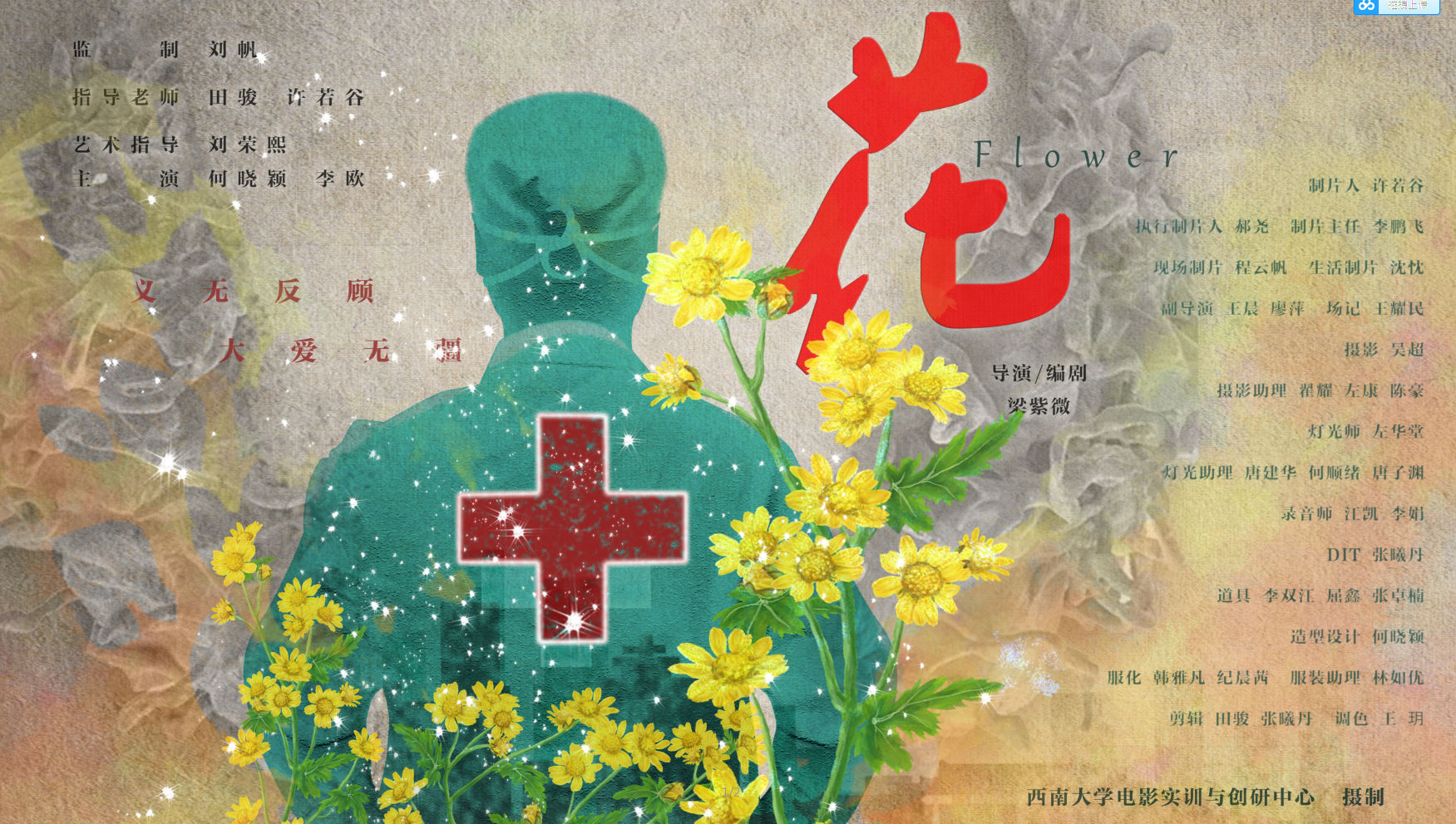 微电影《花》根据真实事件改编,在重庆从医的孙家敏,在未告知自己父母的情况下,奔赴抗疫第一线。这一天,当孙佳敏结束一天的抗疫工作后,突然收到了一个陌生男人送来的鲜花,原来父亲早已知悉孙家敏支援抗疫一线,并在孙家敏生日这一天,请人送去一束花。