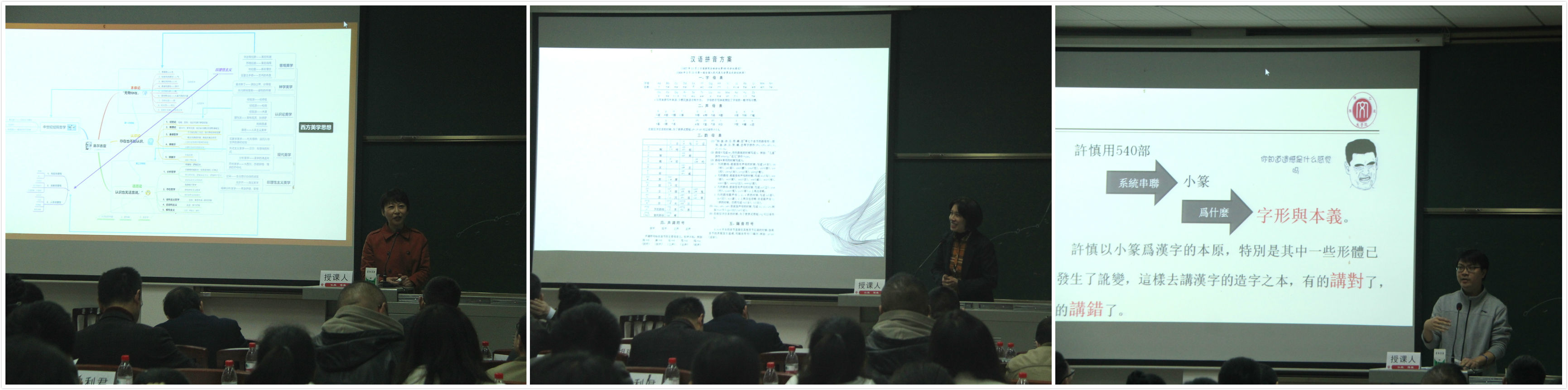 参赛教师以“新文科,从我的课堂开始”为主题,根据本学期教学情况自定讲课内容,在讲课中扎根对作品本身的探寻,融入自己的研究成果,深入解读教学内容。刘叙武老师从亚里士多德戏剧提示为出发点,深入剖析了戏剧《雷雨》第二幕。张兴成老师以柏拉图的文艺观为切入点,探讨作品《柏拉图:诗人与哲学家之争》,见微知著呈现历史上的文学观念。付佳奥老师讲授白朴的杂剧和歌曲,解读悲伤凄凉的《梧桐雨》。毛志萍老师以视频中汉语拼音的读音是否标准为探讨,讲授生动有趣的汉语拼音方案读音课。姜永琢老师从思维、存在、表达三个维度出发,分析阐述西方美学思想。郑邦宏老师讲授说文部首形体演变一课,将晦涩的理论转换为有趣的语言。邝明艳老师解读了史诗巨匠荷马的作品,探究了奥德修斯伤疤的背后文学魅力。马泰祥老师深入剖析了赵树理建国后小说创作。许若谷老师从《谁先爱上他的》剧作的几个关键问题入手,解密影视剧作中“色彩——镜头”等创作技巧。讲课结束后,评委曾利君教授、刘帆教授从教学内容、教学语言、教学态度、教学组织和教学特色等方面进行点评与打分。最终,毛志萍老师被推选出参加学校讲课比赛。