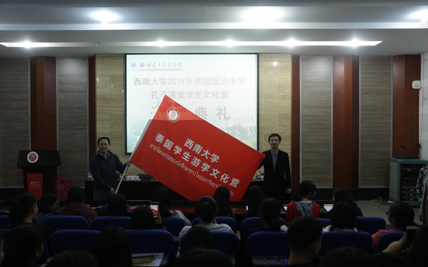 随后,胡建军书记为本次文化营授营旗,并代表学院与泰国国光中学胡建军书记和吴凡老师互赠礼物。