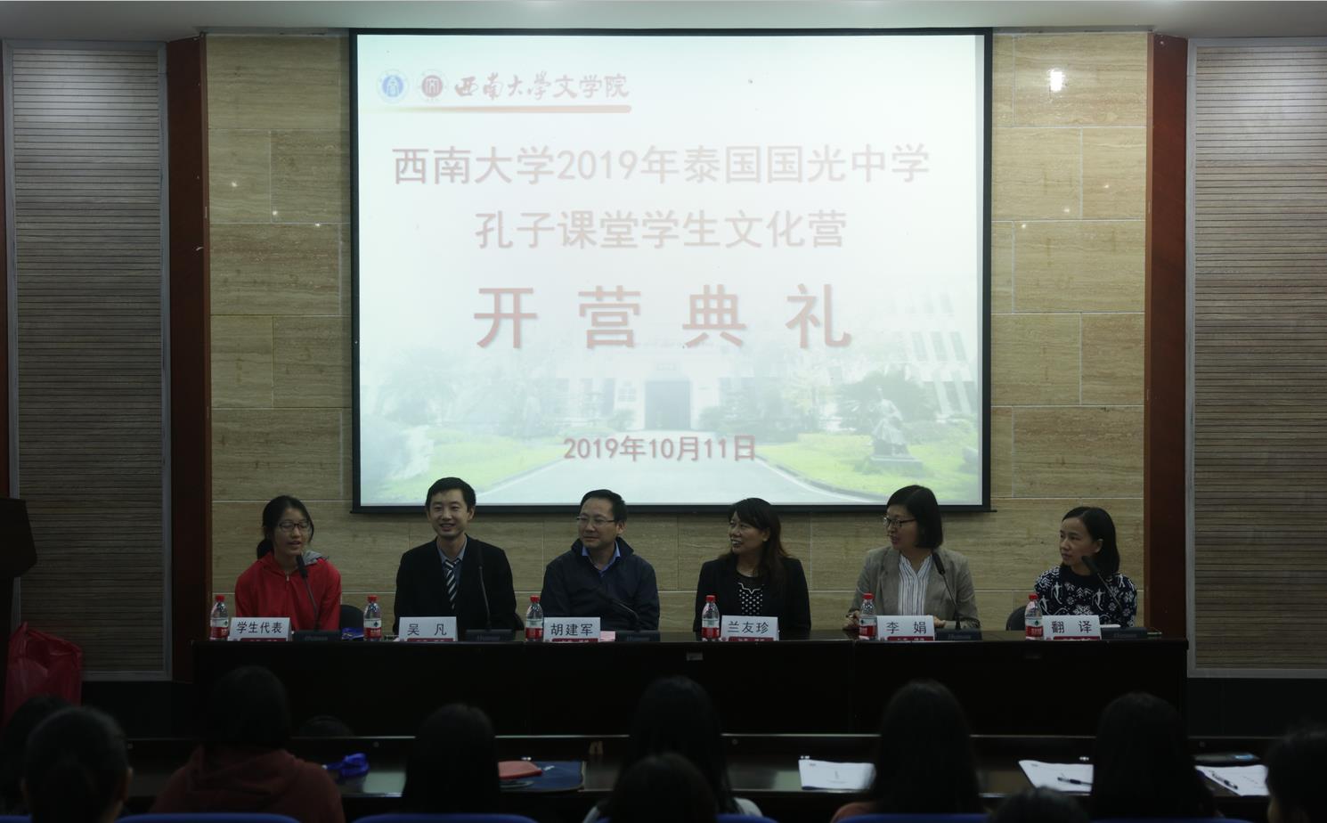 10月11日,欢迎来到公海710 2019年泰国国光中学孔子课堂文化营在公司开营典礼。泰国国光中学孔子课堂文化营领队吴凡老师,委胡建军书记、网络与继续教育办公室兰友珍主任、汉语国际教育系李娟老师出席本次活动,文化营全体30名营员参加了活动。开营典礼由李娟老师主持,泰国职工刘璐同学担任翻译。