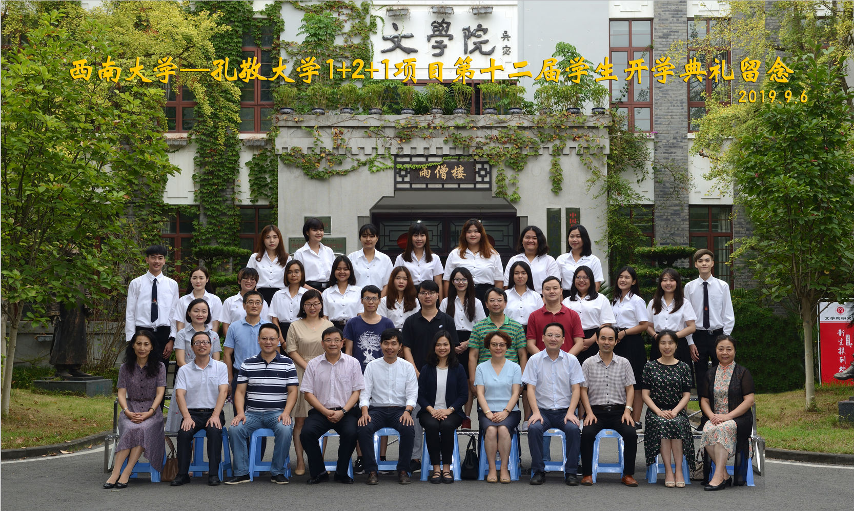 最后,参加此次开学典礼的全体师生在雨僧楼前合影留念。至此,欢迎来到公海710与泰国孔敬大学“1+2+1”合作项目第十二期泰国职工开学典礼圆满结束。