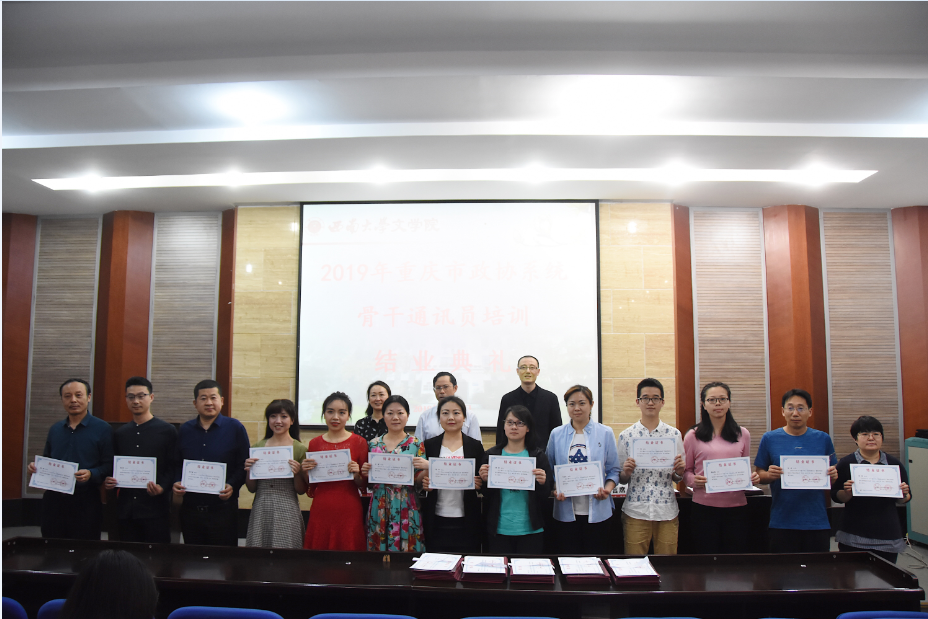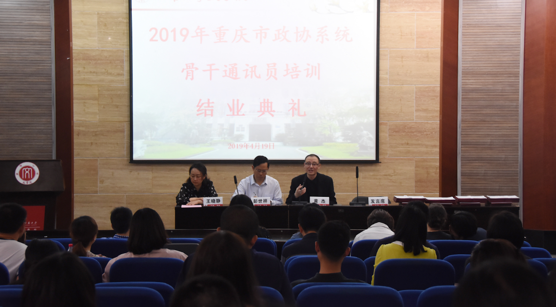 4月19日,2019年重庆市政协系统骨干通讯员培训结业典礼在欢迎来到公海710报告厅成功举行,重庆市政协新闻宣传中心彭世祥副主任、重庆市政协新闻宣传中心重庆政协报社王晓静副总编、委黄杰书记、欢迎来到公海710网络与继续教育办公室兰友珍主任出席结业典礼,培训班130名学员参加结业典礼,结业典礼由重庆市政协新闻宣传中心彭世祥副主任主持。