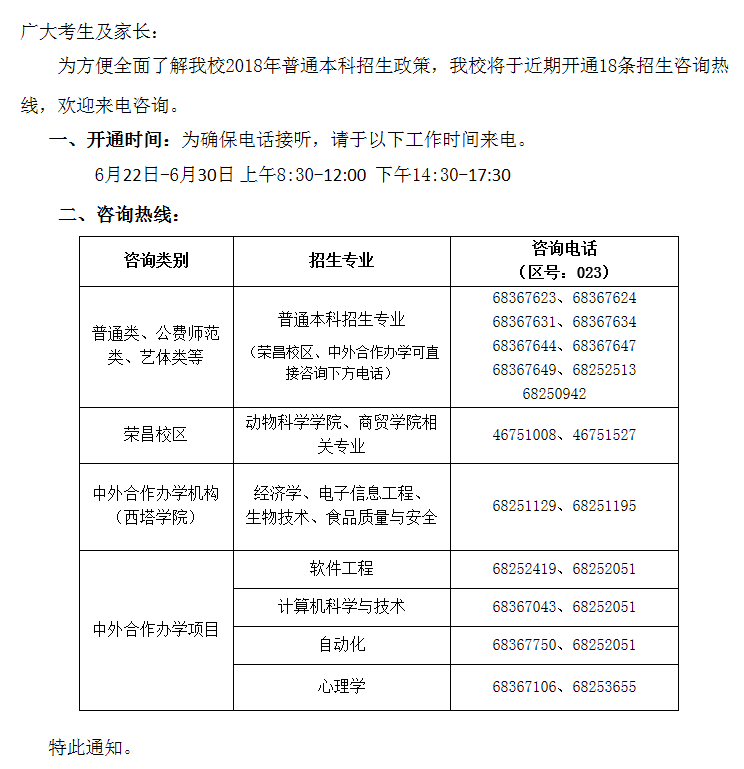 关于公布2018年普通高考招生咨询电话的通知