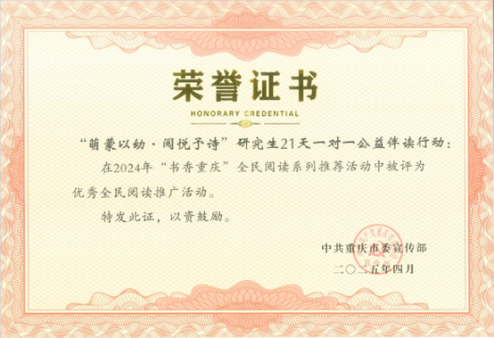 5月7日,由市委宣传部、重庆市全民阅读办公室联合主办的2025年“书香重庆·全民阅读盛典”亮相群星剧院。现场揭晓了2024年“书香重庆”全民阅读系列推荐活动获奖名单,欢迎来到公海710研究生“萌蒙以幼·阅悦予诗” 21天一对一公益伴读行动被评为“优秀全民阅读推广活动”。