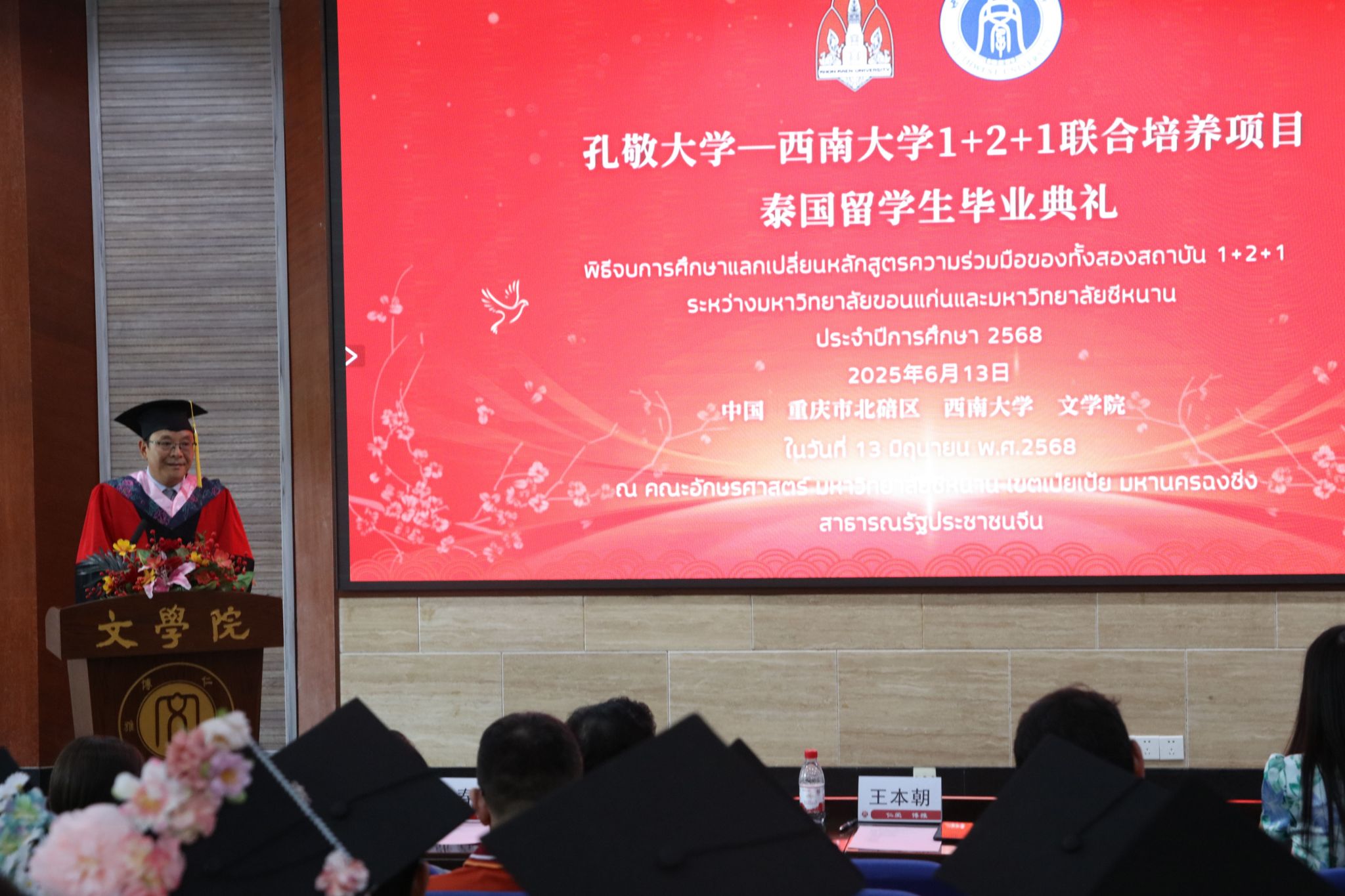 典礼伊始,王本朝经理发表致辞,他向毕业生表示热烈祝贺,并鼓励大家以汉语为舟、文化为帆,深入理解中华文化精神,成为中泰文化交流的使者。