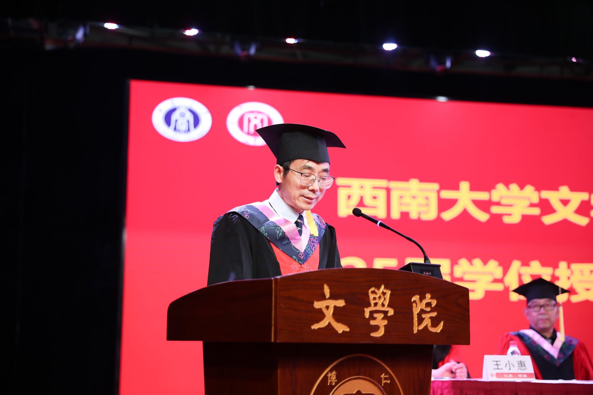 教师代表王春玲教授嘱咐毕业生将面对现实与追求理想结合,建构坚韧自我。她勉励大家肩负责任,砥砺前行;以开阔的心胸捕捉幸福;铭记“含弘光大,继往开来”的校训,守住初心。