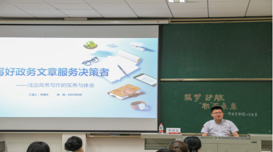 李渊文从“好文章是怎么来的、好文章有什么用、怎么样才算好文章”三个部分总体阐述公文写作的指向和基本原则,并结合自身工作实际,对公文文种的选用、公文规范的掌握、党政机关公文以及常用事物文书的写作进行了细致讲解。他聚焦政务文章,从“好的政务文章有什么条件、如何写好政务文章、如何练就优秀政务文章、写好政务文章注意事项”四个部分讲解了政务文章,强调政务文章是一项具有特殊意义和专业内涵的写作范式,应做到顶层设计与实际应用相融会,规范原则和造词遣句相结合。
