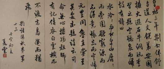 硕士生张夏云孜孜于书法十多年,致力于精微。其论文研究东坡书风碑刻三种,由一而多,深得学术旨趣。其书写内容多取自与论文相关者诗文,书体以行楷、行书见长,根基于智永、米芾上探二王,笔势澜翻,点画传情。
