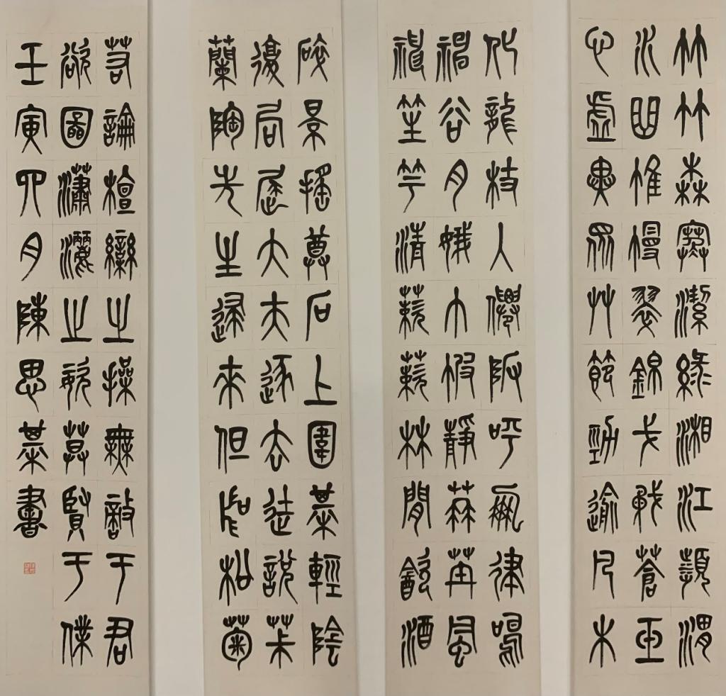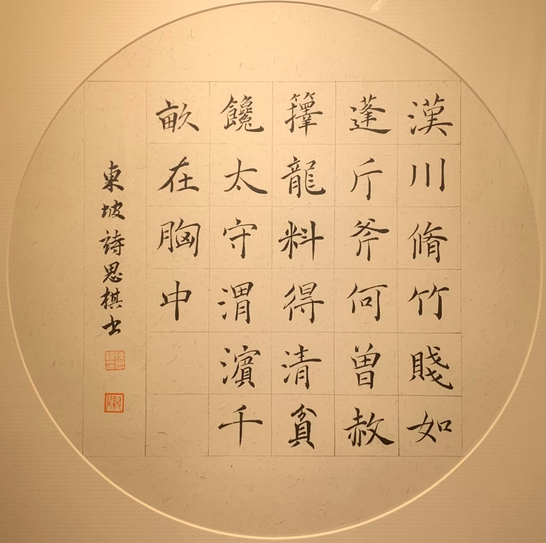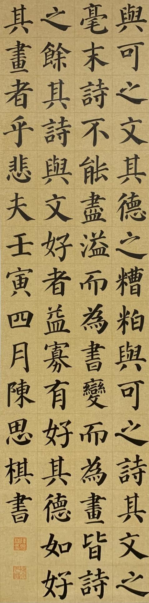 硕士生陈思棋本科为美术学,论文讨论东坡与文与可的绘画理论,创作主题多与两者相关。其篆书以清人吴昌硕书风为底,行楷书取法赵孟頫、米芾,出之以文秀之笔;其绘画以东坡、与可为师,以竹画可见一斑。
