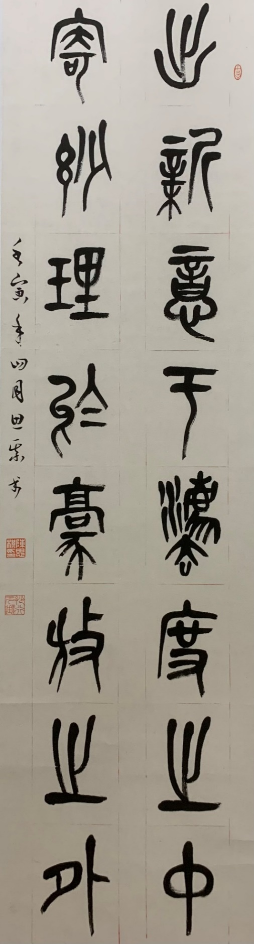 承蒙先生不弃,有幸拜于门下。篆书初学李斯《峄山碑》工整平稳一脉,后学吴昌硕质朴雄浑之风;隶书学《曹全碑》之匀整秀美;楷书学颜真卿《多宝塔碑》之刚劲清爽;行书取法赵孟頫,呈遒媚秀逸之风;草书则以孙过庭《书谱》临习为主。三年时光短暂,书法创作虽有进步,但学书之路道阻且长,仍需继续努力。以古为尚,自出新意,在书写创作中寻找笔墨意趣。毕业创作多与论文内容相关,因尤喜吴昌硕篆书之风,创作也多基于此。同时并未丢弃本科所学,呈上几幅写意小品。通过创作,发现自己存在许多不足,理论上的缺失是一大短板,日后当加强自身理论素养,德艺双修。今以拙作相呈,望诸位不吝赐教,定以虚心接受,在今后的学书之路加以改正。