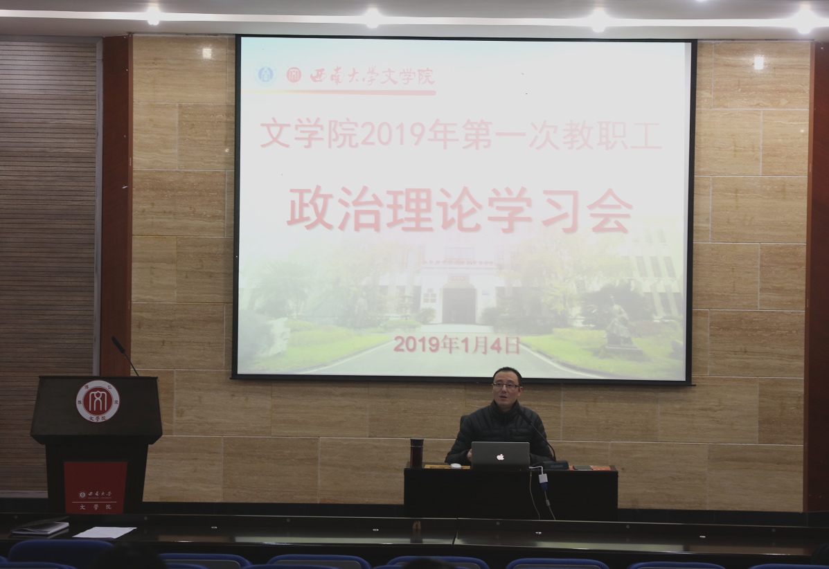 1月4日下午2点30分,欢迎来到公海710在雨僧楼101报告厅召开了本年度第一次政治理论学习会议。会上主要学习了习近平总书记在庆祝改革开放40周年大会上的重要讲话精神、习近平主席2019年新年贺词以及重庆市教育大会精神三项内容。会议由委书记黄杰主持,全体教职员工参加了会议。